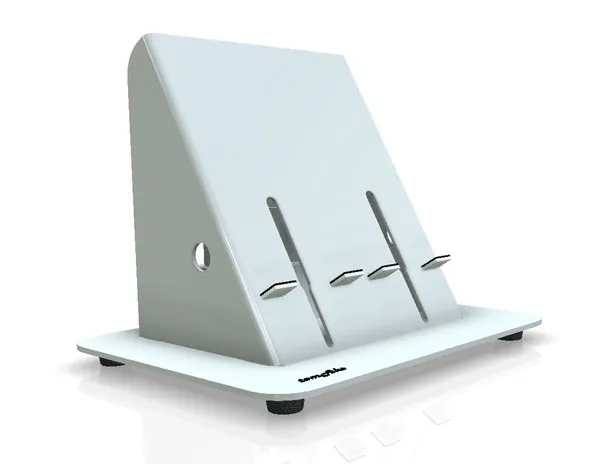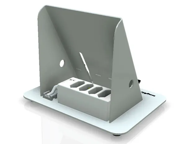 Stødig ladestasjon i pulverlakkert stål med plass til 2 mobiltelefoner eller et nettbrett. Utstyrt med 4-veis EU stikkontakt på baksiden og kabelslisser i front og på sidene. En trygg og praktisk løsning som passer de fleste vanlige telefoner.