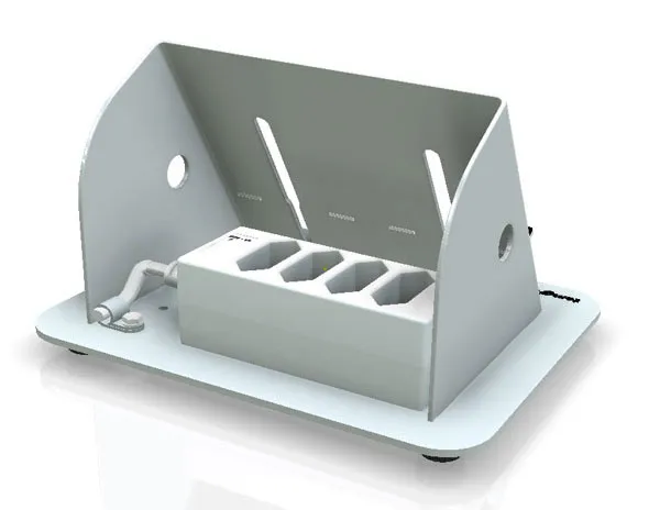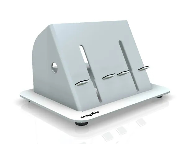 Praktisk og stødig ladestasjon i pulverlakkert stål. Utstyrt med 4-veis EU stikkontakt på baksiden for enkel lading. Passer 1–2 mobiltelefoner og kan også brukes til nettbrett dersom det står stødig. En trygg og brannsikker løsning for lading – ideell på nattbordet.
